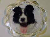 コースターは刺す面積が小さいので全身は刺しゅうできません。お顔のアップになりました。丸いコースターに合わせて、図案も丸くしてあります。 |