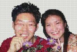 アルコールかはいっている席でのお写真なのでどうしても顔が赤いのですが、そのまま図案化すると飾るにはちょっと色味が赤くなりすぎなので、なるべく素面に見える(?)肌色にしました。