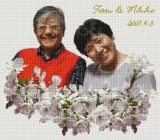 できあがりサイズが小さいため表情が出しにくいので、布も18カウントと細かい布に色数も多く使い、なるべくお写真に忠実に図案化するようにしました。