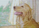 背景も含めての日常風景を図案化したい…ということで、わんこの耳の毛の流れを整え、回りを不定形に型抜きしただけのシンプルな図案となりました。