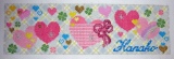 「星とかハートでレインボーのようにカラフルで、英語で名前入り♪ちょっとキラキラがあるといいな」というご希望でしたので、小さい作品ながら色数は多く、ラメ糸を3種類(金、銀、パール)使用しています。