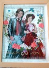 当初はもう少し上半身だけにして、表情がわかるようにお顔を大きめにというご希望でしたが、ドレス姿の下カットはバランスが悪く(>_<)、ほぼ元画像のまま図案化となったためにご希望より一回り大きいできあがりサイズとなっております。 |