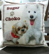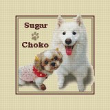 ワンちゃん達も毛色が白、またはほとんど白がメインなので、ハート型に配置したモチーフのお花は思いっきりカラフルにして、クッションにしてお部屋に置いたときに明るくなる色合いで作成しました。   |