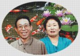 背景は錦鯉がお好きだったということで、錦鯉が泳いでいる自然な色を背景にし、それだけだと色合いが暗くなってしまうので、ピンクの花のスイレンを浮かべました。