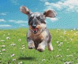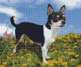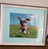 わんこ中心にトリミングし、背景は青空と芝生、わんこが映える小花というご希望です。