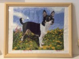 背景は左上に白い部分があるのとわんこを目立たせるために、全面刺しではなく楕円に型抜きし、前足と左耳は飛び出させました。 |