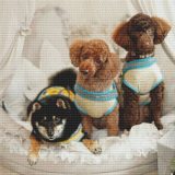 構図は原画をわんこ中心に正方形にトリミングし、背景のピンク色がお好きでないということで一度わんこ達と切り離し、背景だけご希望のベージュ系に変更してあります。 |