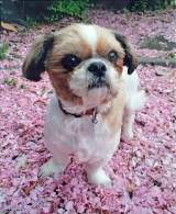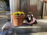 花と犬をバランス良く合成してほしい、足元は自然な土の雰囲気で、とのご希望です。