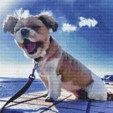 リードを削除し、左のわんこのお顔を他の笑っている写真のお顔に変更(合成)したい、とのご希望です。