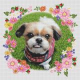 その場合、わんちゃんのシルエットがほぼ正方形なので、構図も正方形とし、周りにモチーフにてお花の配置しました。
