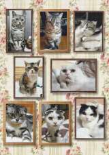 8匹の猫ちゃんたちを額縁に入れ、明るい色の可愛い花柄などの壁紙に掛ける構図をご希望です。