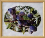 この原画のままだと後ろの葉がごちゃごちゃして何がメインなのかわかりづらく、また背景を刺すのも大変です。刺す部分を少なくするためにも縁をぼかして楕円に型抜きし、一部、プルーンの実と葉を立体的にトリミングから飛び出させてみました。これでメインの実がすっきり見えるようになりました。贈り先名は控え目な金ラメで華やかさを出しました。