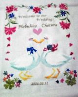 また、背景の文字数も多く、全体にバランスよく、且つクロスステッチにしてちゃんと読めるような図案にするのに苦労しました。(^^ゞ |