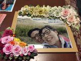 初めは周りモチーフで囲ったり、お花で囲ったり…というご希望でしたが、「それぞれの写真がピンで壁に貼ってある風に、背景は自然な草花で」という方向になりました。