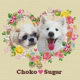 ハートの枠の中に、2匹の犬の顔を同じ大きさで入れて、ハートの後ろは、花で囲む。またお花は明るい色合いで・・・というご希望です。(*^^*)