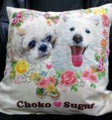 ワンちゃん達も毛色が白、またはほとんど白がメインなので、ハート型に配置したモチーフのお花は思いっきりカラフルにして、クッションにしてお部屋に置いたときに明るくなる色合いで作成しました。   |