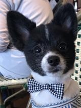 わんこ中心にトリミングし、背景は青空と芝生、わんこが映える小花というご希望です。