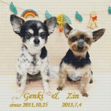 構図は原画をわんこ中心に正方形にトリミングし、背景のピンク色がお好きでないということで一度わんこ達と切り離し、背景だけご希望のベージュ系に変更してあります。 |